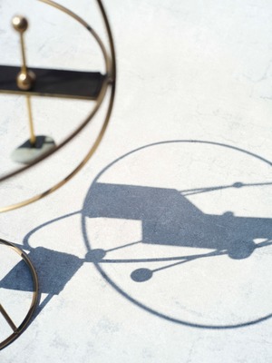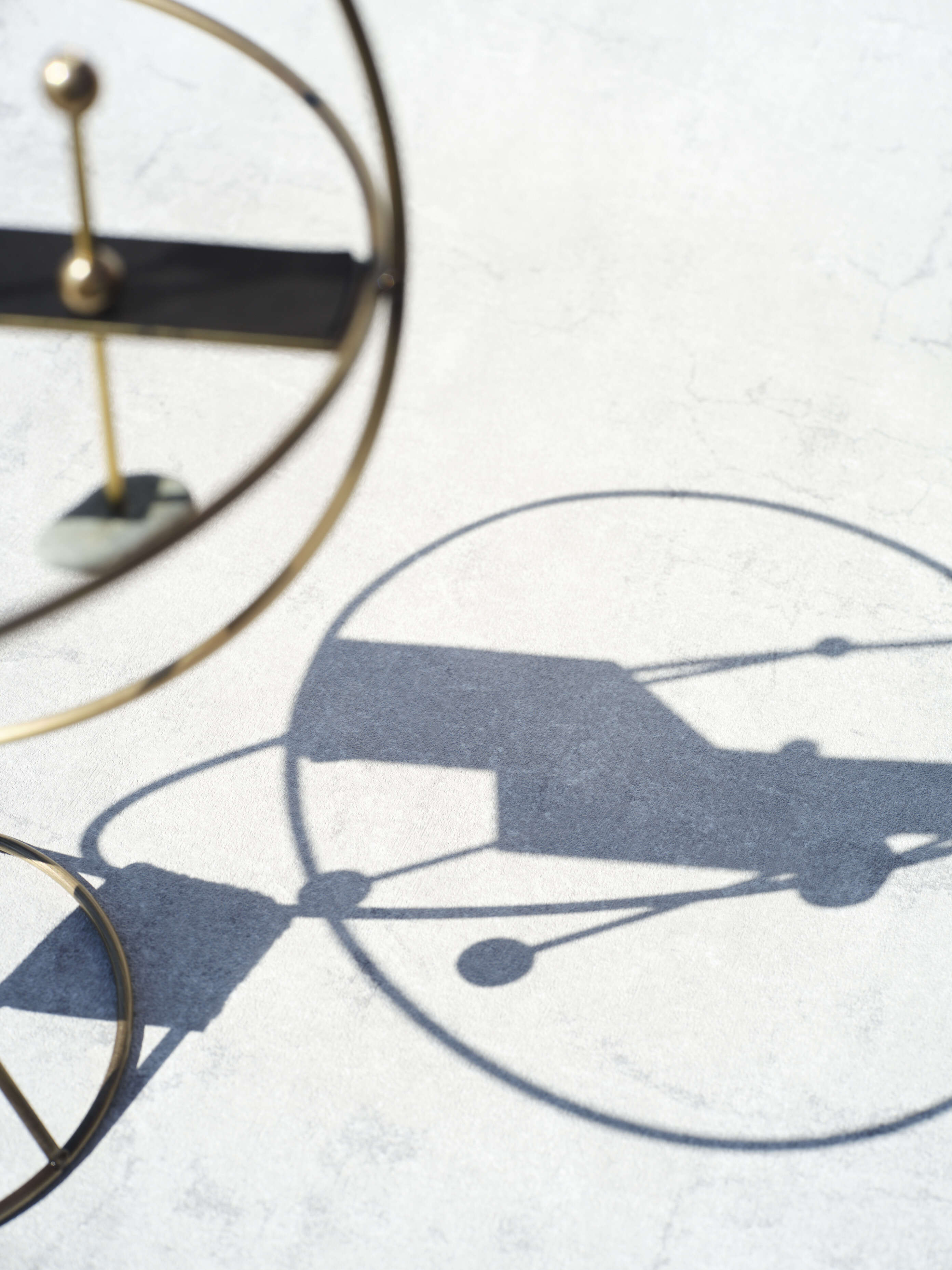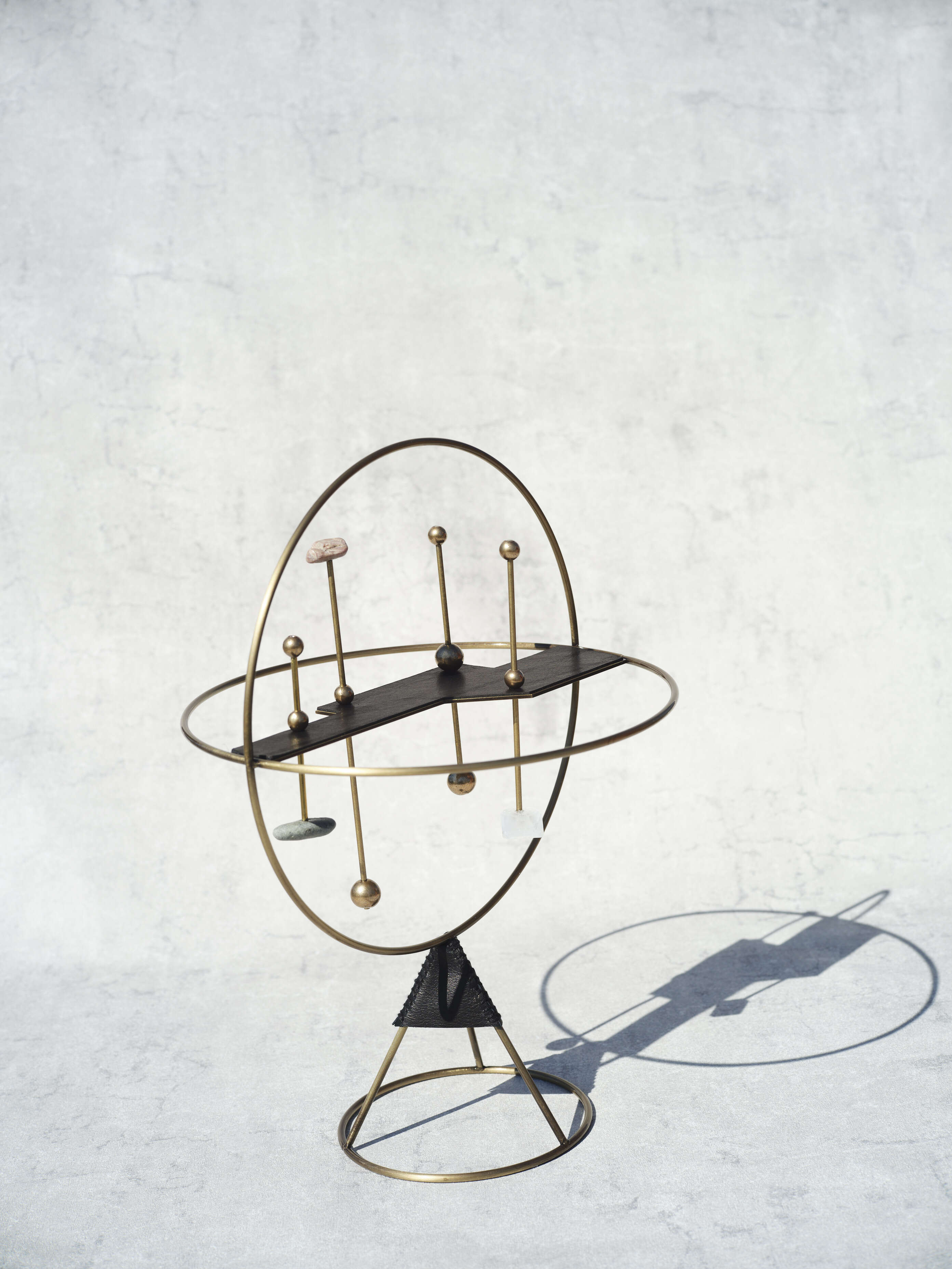 地球儀のある家に憧れ、コペルニクスの地動説や重力などの天体物が好きだったデザイナーの感情を込めたオブジェ。水平な世界に広がる様々な矛盾を石を用いて表現。天動説から地動説ように考え方が変わった時代の変動の波を感じれる一点。